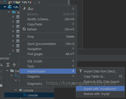 mysqldump를 활용하려면 mysql workbench를 설치해야 합니다. 얼마전에 ERD 경험을 위해 설치했던 것이 이렇게 시간 세잎을 해줬습니다. 어쨌든 DataGrip에서 작업할 대상을 찾고 클릭 후 우클릭을 통해 Import/Export의 Export with 'mysqldump'를 실행해줍니다.